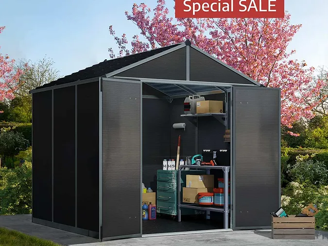 מחסן רוביקון אולטרה חזק בעל שלדת אלומיניום אל-חלד וקירות פולי קרבונט כפול דופן בלתי שביר, השומרים על צורתם וצבעם לאורך השנים ומספקים הגנה מלאה מפני קרינת UV