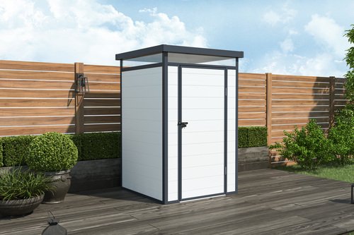 מחסן פלסטיק עמיד עם גג סקייליט בחלקו העליון.יתרונות המחסן: