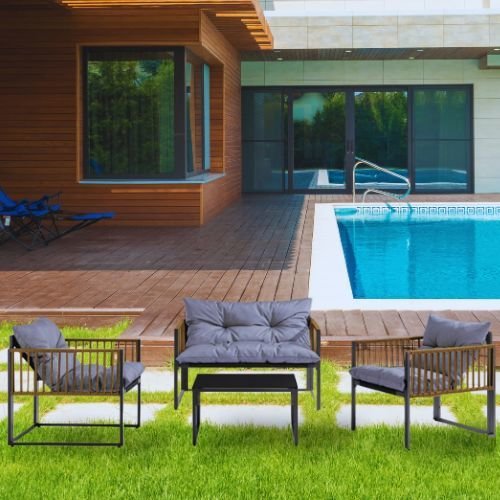 פינת ישיבה מפנקת בעיצוב מודרני משילדת ברזל בשילוב ראטן למראה יוקרתי.