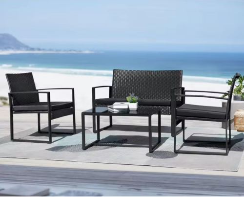 פינת ישיבה ראטן דגם סיאטל – עיצוב שחור יוקרתי עם שולחן זכוכית וכריות תואמות