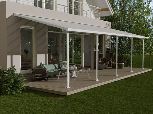 פרגולת Feria מבית Canopia (פלרם) בגודל מרשים של 3×9.2 מ' מהווה פתרון קירוי אלגנטי, חזק ואיכותי לכל חצר, מרפסת או אזור ישיבה. שלדת האלומיניום הלבנה משולבת עם קירוי פוליקרבונט לבן-אופל, המעניקים מראה נקי, מודרני ויוקרתי – תוך שמירה על הגנה מלאה מקרני UV מזיקות.